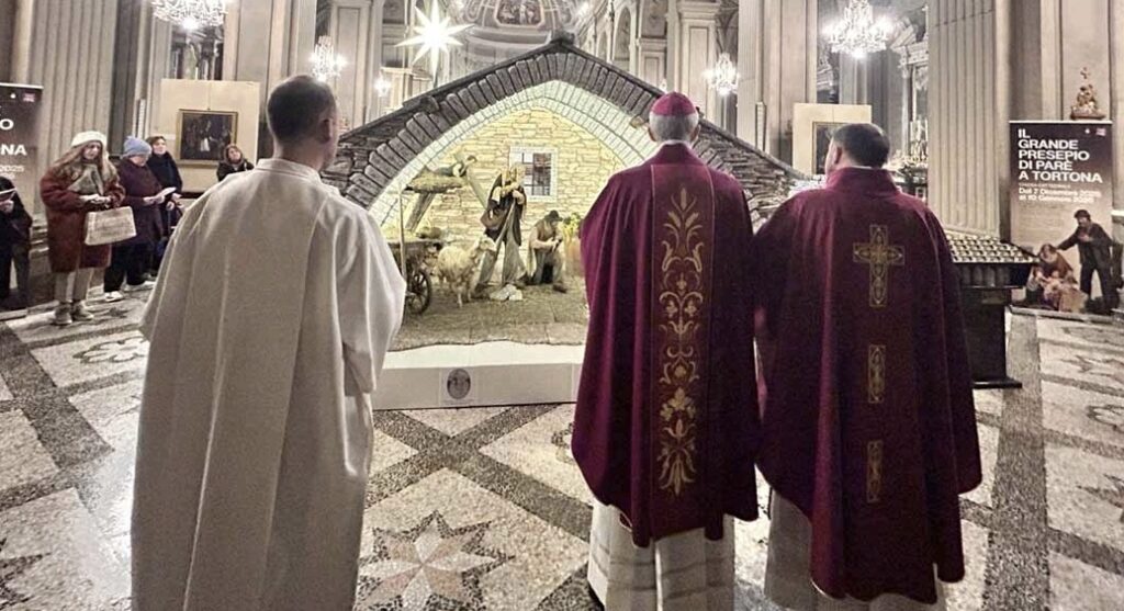 TORTONA – Martedì 16 dicembre alle ore 7 è iniziata, con il Canto delle Profezie seguito dalla S. Messa, la Novena di Natale in Cattedrale che prosegue fino a mercoledì 24 dicembre. Come per la Novena dell’Immacolata, a presiedere le celebrazioni eucaristiche, insieme al vescovo che ha aperto il cammino, sono i canonici della cattedrale che si alternano quotidianamente. Nell’omelia di martedì, Mons. Marini ha posto l’attenzione sulla vera essenza del Natale, citando una frase che aveva colpito il lette- rato italiano Giovanni Papini, do- po la sua conversione, e che era del frate francescano Angelo Silesio: “Gesù potrebbe nascere a Betlem- me mille, diecimila volte, ma risulterebbe del tutto inutile se almeno una volta non nascerà nel tuo cuore”. Ha poi ricordato la preghiera che si ripete in questi giorni – “Vieni Signore non tardare” – perché con questa invocazione «non chiediamo al Signore di fare presto, chiediamo a noi di essere pronti alla sua venuta. Non perché il Signore tardi a venire, ma perché noi a volte non siamo pron-ti ad accogliere la sua venuta». È dunque importante «mettere da parte tutto quello che non dà vera gioia, non dà vero senso, non dà vera ragione alla nostra esistenza per accogliere Gesù che è il senso, la ragione e il significato, il fondamento vero della nostra vita». Al termine Mons. Marini si è recato davanti alla capanna in fondo alla cattedrale per innalzare la lode al Signore in attesa della sua venuta. Per la solennità del Natale il vescovo presiederà le celebrazioni nella Cattedrale e nel santuario della Madonna della Guardia a Tortona. Tra gli appuntamenti principali la S. Messa nella Notte di Natale (mercoledì 24 dicembre) alle ore 23; la Messa nel Giorno di Natale (giovedì 25 dicembre) alle ore 10.30 e alla Guardia alle ore 17. Un altro importante appuntamento per la Comunità Diocesana è quello di domenica 28 dicembre, alle ore 16, sempre in Cattedrale quando Mons. Marini celebrerà la Santa Messa di chiusura del Giubileo. Inoltre, il vescovo presiederà in Cattedrale anche le celebrazioni di fine e inizio anno: i Primi Vespri di Maria Santissima Madre di Dio mercoledì 31 dicembre alle ore 18, con il canto del “Te Deum” e la Benedizione Eucaristica; la Santa Messa e nella solennità di Maria Madre di Dio giovedì 1° gennaio 2026 alle ore 18 e l’Eucaristia dell’Epifania del Signore martedì 6 gennaio alle ore 10.30 in Cattedrale e alle ore 17 alla Guardia.